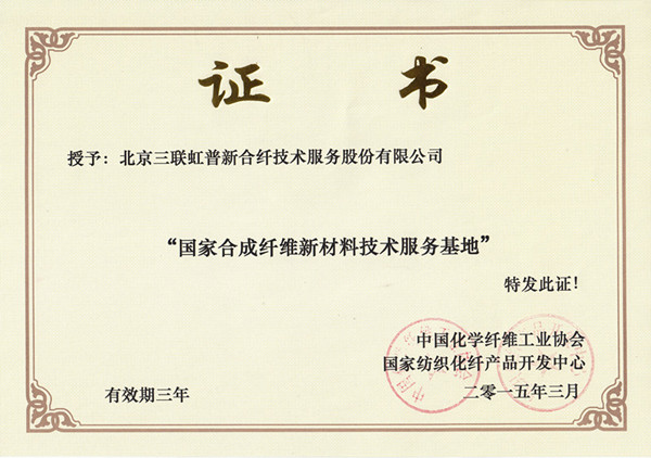 近日,三聯虹普被中國化學纖維工業協會、國家紡織化纖產品開發中心聯合授予“國家合成纖維新材料技術服務基地”。